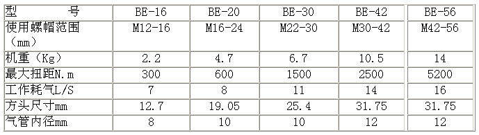 氣扳機(jī)安全防爆、扭矩大、重量輕、體積小、效率高、結(jié)構(gòu)簡單、維修方便,是您最理想的選擇~~~不看會后悔的哦!~~ 即使您的煤礦井下風(fēng)壓波動大, BK30氣扳機(jī)也能夠正常使用,而且它可用于U型鋼支架和錨桿支架螺母的旋緊和拆卸,樹脂錨桿的攪拌以及其他機(jī)電設(shè)備的螺母裝拆,能夠提高U型鋼支架和錨桿支架的使用性能,保證支護(hù)質(zhì)量。BK系列氣扳機(jī)還可廣泛用于汽車、造船、石油化工、機(jī)車車輛、工程建筑等行業(yè)。