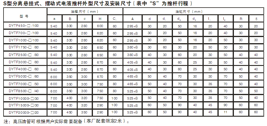 - DTYF型分離式電液推桿即電動液壓推桿,適用于往復(fù)推拉直線(或往復(fù)旋轉(zhuǎn)一定角度)運(yùn)動,可用于上升、下降或夾緊工作物的場所,DTYF型分離式電液推桿也可用于遠(yuǎn)距離及高空危險地區(qū),并可和計算機(jī)聯(lián)網(wǎng)進(jìn)行集中(程序)控制。DTYF型分離式電液推桿常用的結(jié)構(gòu)型式有DYTZ整體直式電液推桿,DYTP平行式電液推桿,DYTF分離式電液推桿。DTYF型分離式電液推桿現(xiàn)已廣泛應(yīng)用于冶金、礦山、煤炭、電力、機(jī)械、糧食、水泥、化工、水利、運(yùn)輸?shù)炔块T,是不可缺少的通用動力源。