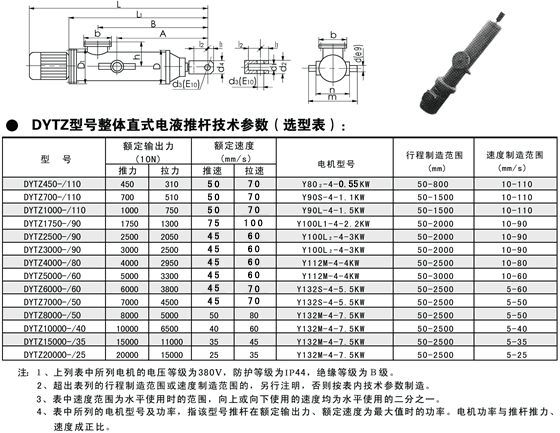 - DYTZ型整體式電液推桿是一種集機(jī)、電、液為一體的液壓驅(qū)動(dòng)機(jī)械手,適用于需要往復(fù)推拉直線(或往復(fù)旋轉(zhuǎn)一定角度)運(yùn)動(dòng),也可用于需要上升、下降或夾緊工作物的場所,并可實(shí)現(xiàn)遠(yuǎn)距離危險(xiǎn)地區(qū)的集中或自動(dòng)控制。DYTZ型整體式電液推桿廣泛應(yīng)用于冶金、礦山、電力、煤炭、機(jī)械、交通、糧食、化工、水泥、水利、建材、運(yùn)輸?shù)炔块T,是一種通用的動(dòng)力源。DYTZ型整體式電液推桿是一種機(jī)、電、液一體化的新型柔性傳動(dòng)機(jī)構(gòu),它以執(zhí)行機(jī)構(gòu)(油缸)、控制機(jī)構(gòu)(液壓控制閥組)和動(dòng)力源(油泵電機(jī)等到)組成。根據(jù)現(xiàn)場安裝空間及用戶使用情況電液推桿可有多種結(jié)構(gòu)形式(具體見電液推桿外形尺寸圖,也可根據(jù)用戶要求定制樣式)。電動(dòng)機(jī)通過正反轉(zhuǎn)驅(qū)動(dòng)雙向液壓泵正反輸出壓力油,經(jīng)液壓控制閥送至油缸,也實(shí)現(xiàn)活塞桿的往復(fù)運(yùn)動(dòng)。液壓控制閥組主要由溢流閥,吸油單向閥,調(diào)速閥(用戶要求),液控單向閥(液壓鎖)等組成也可根據(jù)電液推桿的工作特性,設(shè)計(jì)不同功能的油路組合閥,滿足其工作要求。一般有推出自鎖,拉回自鎖和推拉均自鎖;運(yùn)行速度有可調(diào)速型,不可調(diào)速型;電液推桿工作角度有水平推,向上推(包括斜向上),向下推(包括斜向下)等幾種。電液推桿主要有以下優(yōu)點(diǎn):(1)結(jié)構(gòu)緊湊、安裝方便、占據(jù)空間小、維護(hù)簡單。(2)可帶負(fù)荷起動(dòng),具有過載保護(hù)功能。(3)回路設(shè)雙向液壓鎖,可停在規(guī)定行程范圍內(nèi)的任意位置并自鎖,且保持輸出力不變。(4)推拉力,速度(用戶要求)無級可調(diào),驅(qū)動(dòng)力范圍極廣。(5)因故斷電,推桿自鎖,避免發(fā)生事故。(6)采用全液壓傳動(dòng),動(dòng)作靈敏,運(yùn)行平穩(wěn),能有效緩沖外來沖擊力,行程控制精確(≥0.5mm)(7)機(jī)電液一體化全封閉結(jié)構(gòu),工作油路循環(huán)于無壓的封閉鋼筒里,體積小,不滲油,在惡劣的工作環(huán)境下,不吸塵,不進(jìn)水,內(nèi)部不銹蝕,使用壽命長。DYTZ型整體式電液推桿是我公司成立前針對國內(nèi)中,大推力檔電動(dòng)拉桿產(chǎn)品空白,而顧客又有需求的情況下于1988年起率先自主開發(fā)并獨(dú)家生產(chǎn)的系列產(chǎn)品,是我公司多種電動(dòng)推拉桿系列產(chǎn)品之一。該產(chǎn)品已在首鋼,包鋼等多家大鋼鐵企業(yè)推廣應(yīng)用,也可用于其他需要大推,拉力的場合。其使用條件為環(huán)境溫度-15℃-60℃,相對濕度≤85%。DYTZ型整體式電液推桿由驅(qū)動(dòng)電機(jī),減速器,滑動(dòng)螺旋傳動(dòng)機(jī)構(gòu)等主要部分組成。內(nèi)部設(shè)有彈簧緩沖機(jī)構(gòu)及超載保護(hù)裝置,可保證產(chǎn)品安全,可靠地運(yùn)行。DYTZ型整體式電液推桿的性能參數(shù),外形及安裝尺寸符合《Q/320211AKA01-2000電動(dòng)推拉桿》企業(yè)標(biāo)準(zhǔn)的規(guī)定,其具體數(shù)據(jù)表列如下。